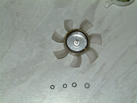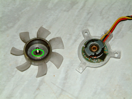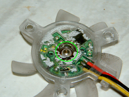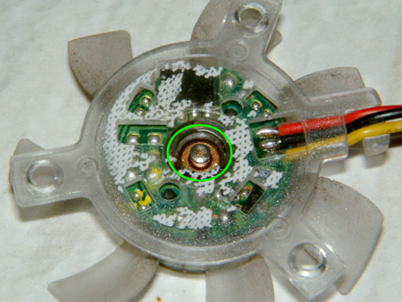 Get the fan off the heat sink and remove the sticker off the back, this will reveal the shaft and a small plastic c-clip Remove the c-clip with some small watchmakers screwdrivers, sewing pins can also work very well. Once the fan blade assembly is off remove the small rubber/plastic washers from the spindle and remove all the old grease from both the washers, spindle and the bushing Then simply apply some very light silicone lubricant to the washers and spindle and put it all back together the way it came apart. Then reinstall back into your PC! |