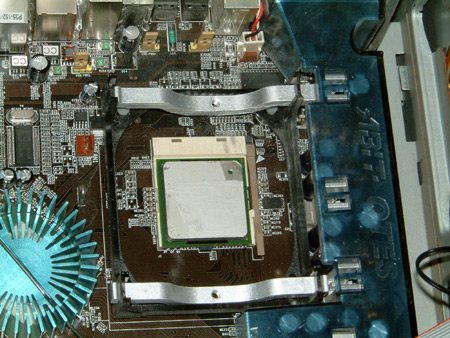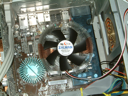 Installing Zalman CPNS7000A-ALCU onto Abit IC7-MAX3 In an attempt to make my PC a bit quieter i'd installed an Enermax UC-A8FATR4 fan controler but found the stock intel cooler fan did not like being throttled down to a lower speed. So i opted for the Zalman CPNS7000A-ALCU instead, because it was quiet and actually fitted around the IC7-MAX3's OTES ducting. The HSF itself: Ok, first off remove the old cooler and apply Arctic Silver to the chip Then install CPU and the retention clips. Then simply screw down the cooler... simple! |