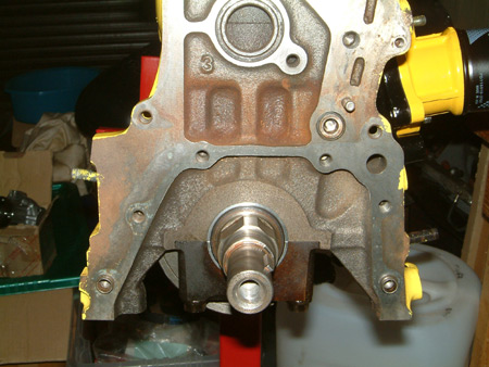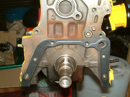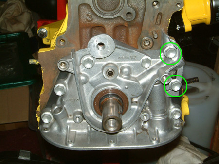 Attach oil pump with a new oil seal. The two bolts circled in green are the two slightly longer bolts.